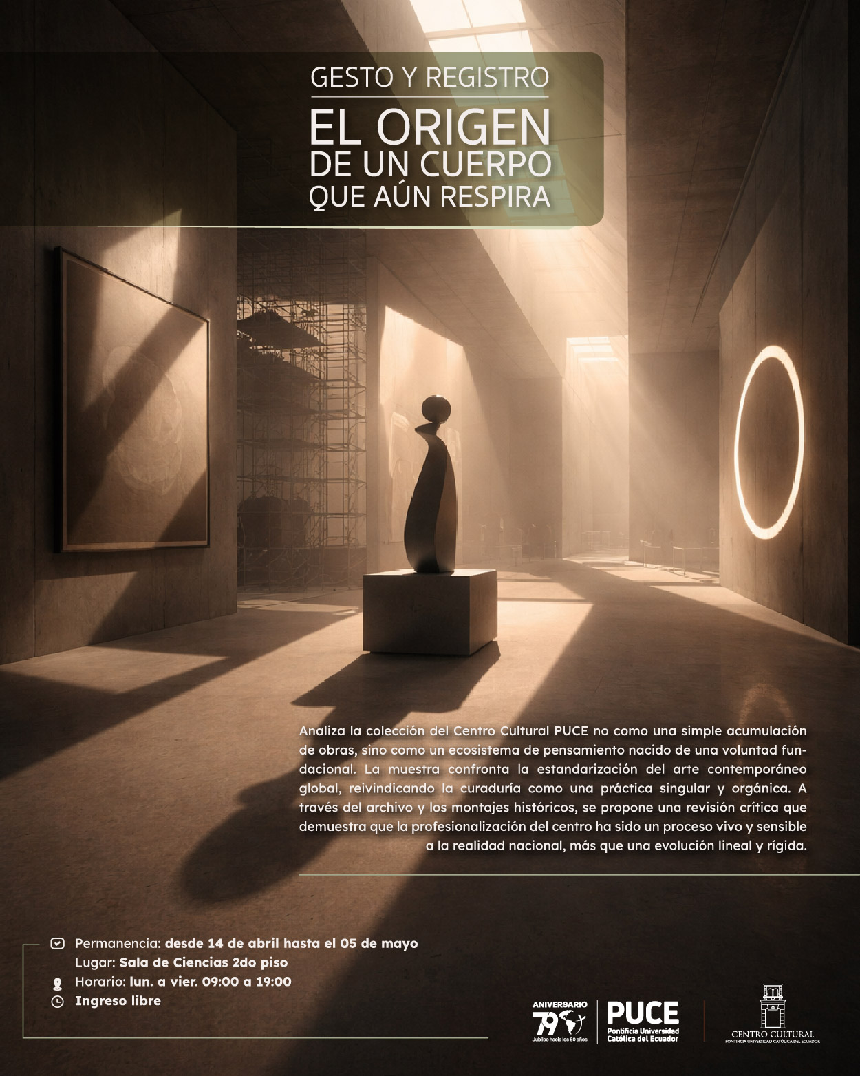 Inauguración: jueves 30 de abril / 11:00 Lugar: Galería Principal y de Cristal Centro Cultural PUCE Permanencia: hasta el 03 de mayo Horario: lun. a vier. 09:00 a 19:00 Ingreso libre