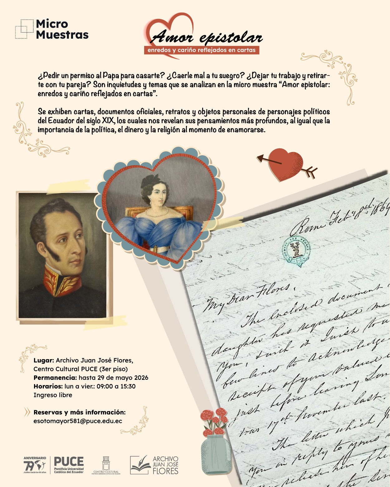 Lugar: Archivo Juan José Flores, Centro Cultural PUCE (3er piso) Permanencia: hasta 29 de mayo 2026 Horario: lun a vier.: 09:00 a 15:30 Reservas y más información:esotomayor581@puce.edu.ec